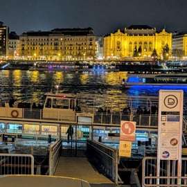Rozpocznij wieczór przy nabrzeżu po stronie Budy, tuż między Mostem Łańcuchowym a Mostem Elżbiety. Miejsce zbiórki jest łatwe do znalezienia – to jedyny dok w okolicy, położony u podnóża Zamku Budy. Wsiądź na dwupoziomową łódź z tarasem na dachu, z którego rozciągają się niezakłócone widoki. Chociaż statek może pomieścić do 150 osób, każda podróż jest ograniczona do 60 gości, dzięki czemu wszyscy mogą wygodnie rozsiąść się zarówno na otwartym pokładzie na dachu, jak i w ogrzewanym pomieszczeniu.