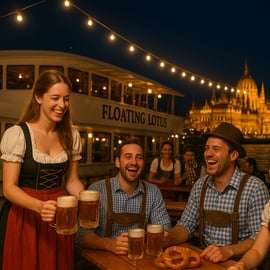 To festiwal na wodzie: kufle piwa brzęczą, muzyka na żywo wypełnia pokład, światła migoczą, a przed Tobą rozciąga się zapierająca dech w piersiach panorama miasta.