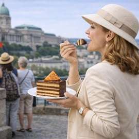 Dopełnij swoją podróż kawałkiem tortu Dobos – jednego z najbardziej kultowych węgierskich deserów – który powstał w złotej epoce budapeszteńskiej kultury kawiarnianej. Delektując się tym ciastem, poznasz historię tego eleganckiego deseru, który stał się symbolem wyrafinowania w całej Monarchii Austro-Węgierskiej.